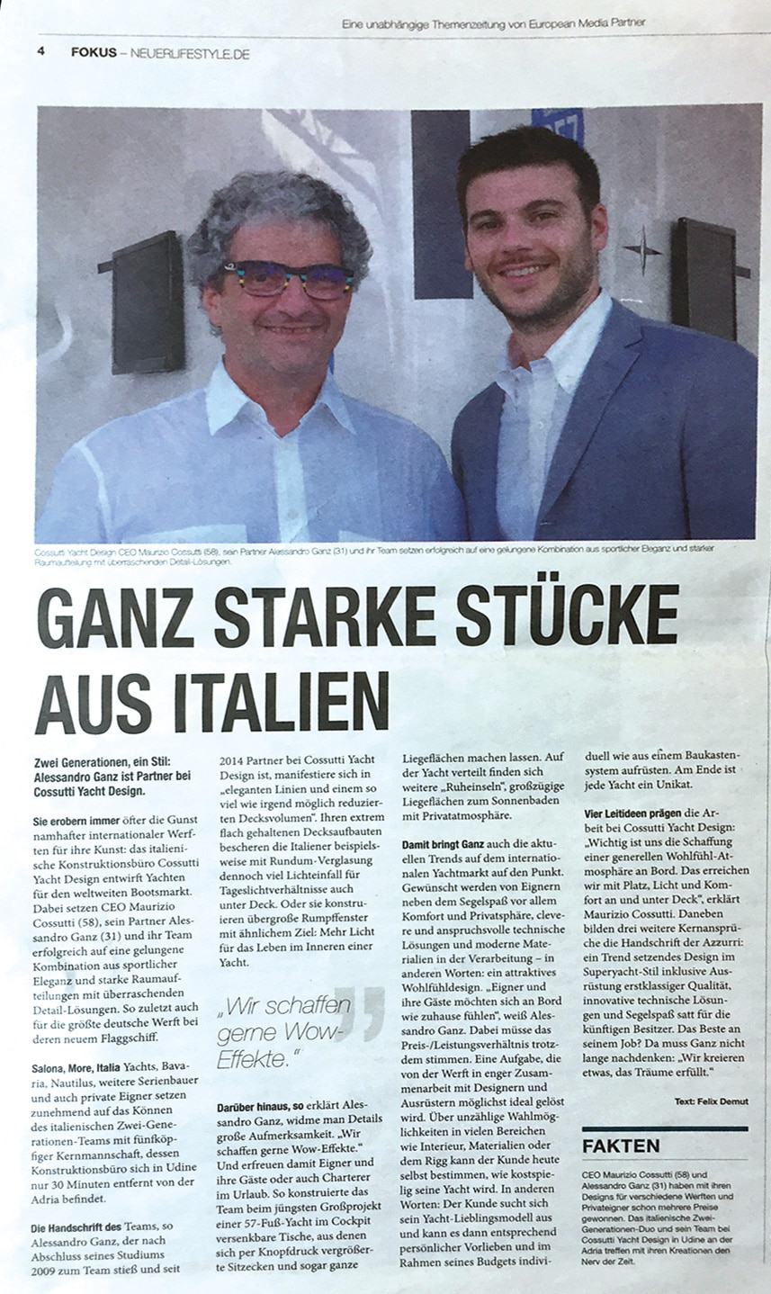 Neue Bootswelt: Ganz Starke Stucke aus Italien by Valentina Goi Press, Company News Febbraio 16, 2017 Zwei Generationen, ein Still: Alessandro Ganz ist Partner bei Cossutti Yacht Design Share:
